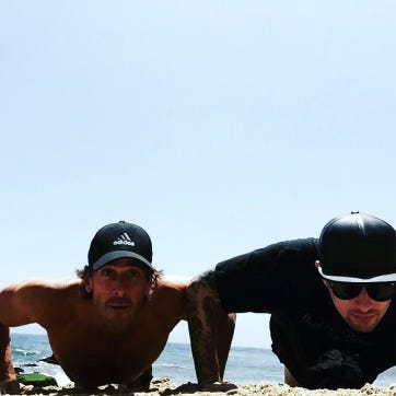 Doing push-ups on the beach in a Dead Can Dance shirt with Greg…